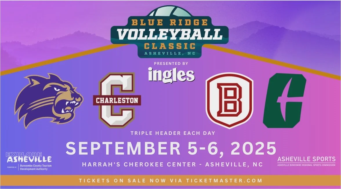 Four NCAA women’s volleyball teams are gathering in Asheville this September for the inaugural Blue Ridge Volleyball Classic tournament. This is the first collegiate volleyball tournament at Harrah’s Cherokee Center—Asheville since the venue signed on as the official host of the Ingles Southern Conference Women’s Volleyball Championship (2025-2027). The year’s lineup includes host Western Carolina Catamounts and features the College of Charleston Cougars, the University of North Carolina at Charlotte 49ers, and Bradley University Braves.